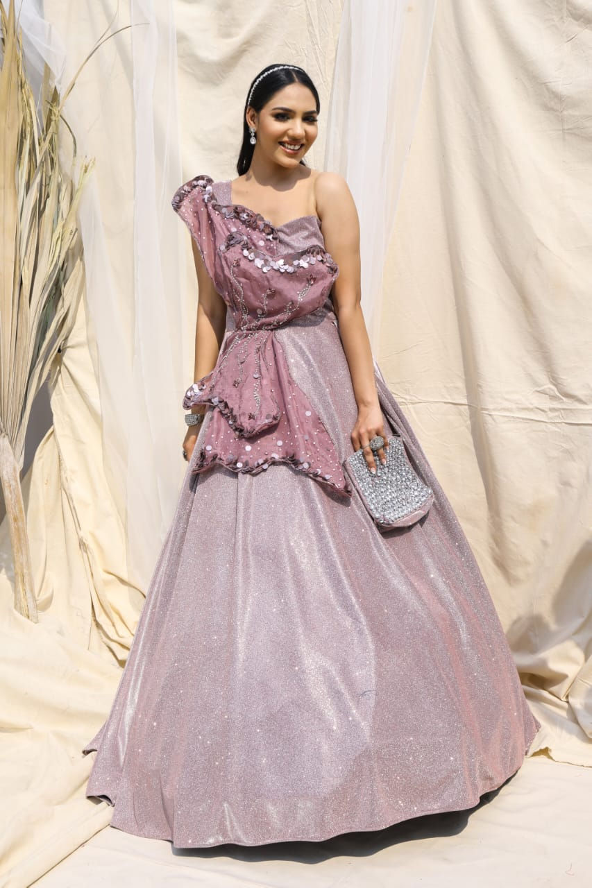 Magenta draped saree detached in bustier, draped skirt and palla as a dupatta